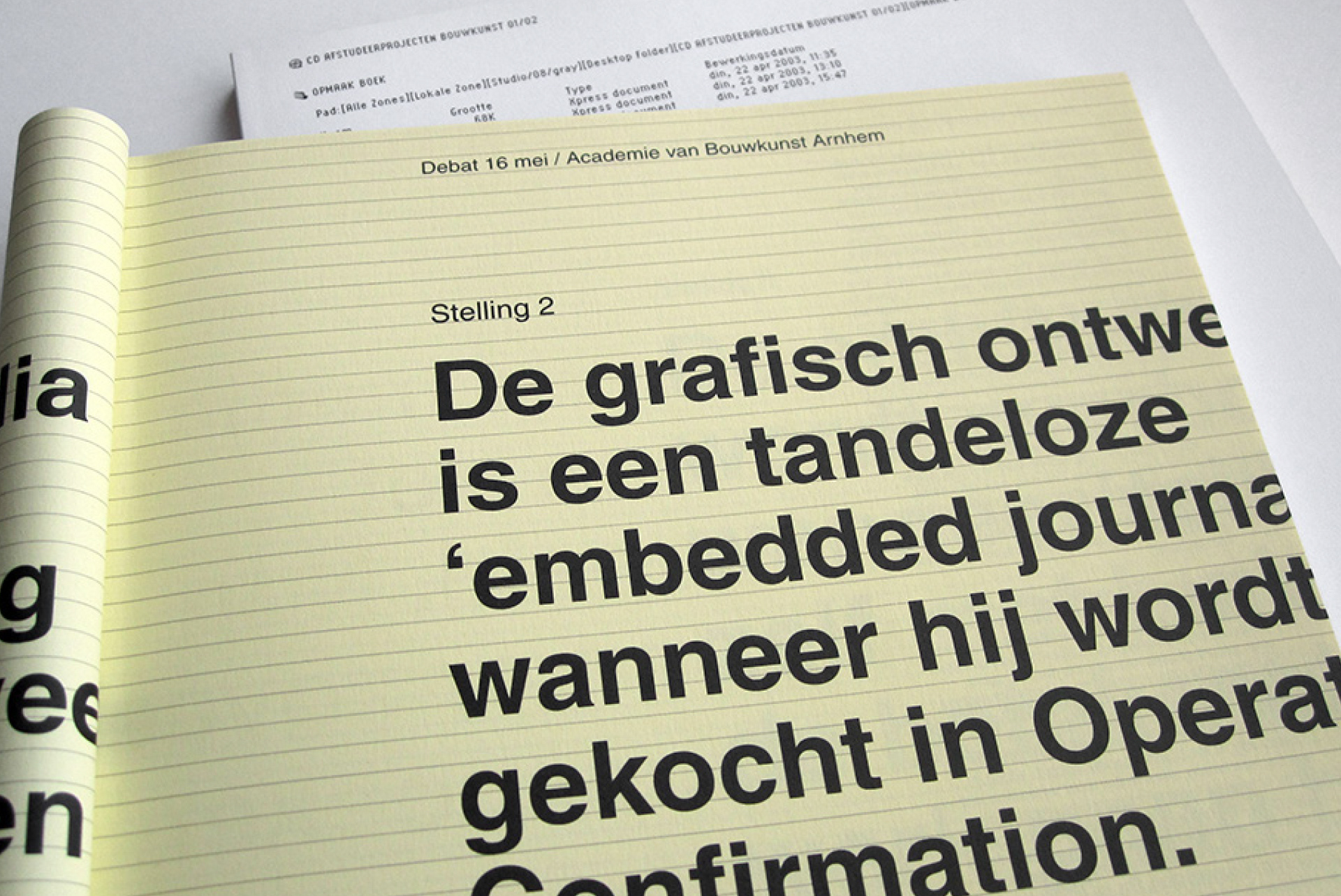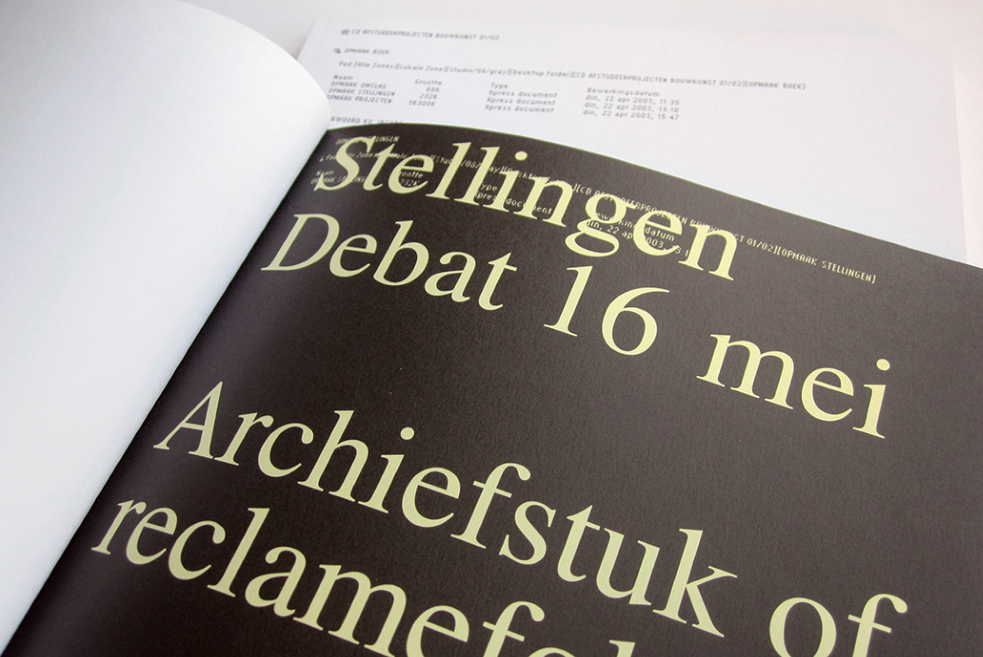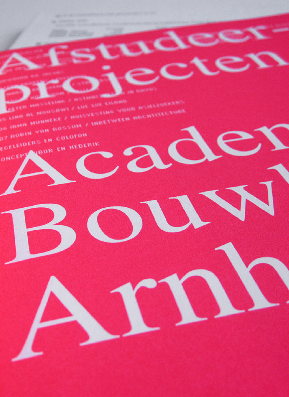 Deze afstudeercatalogus is ontworpen met als uitgangspunt: de representatie van architectuur. De catalogus is genomineerd voor de Roos Geesink prijs als beste ontwerp van de afdeling Grafisch Ontwerpen (Artez).