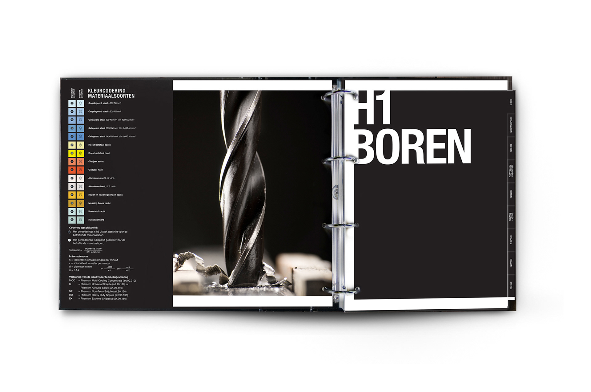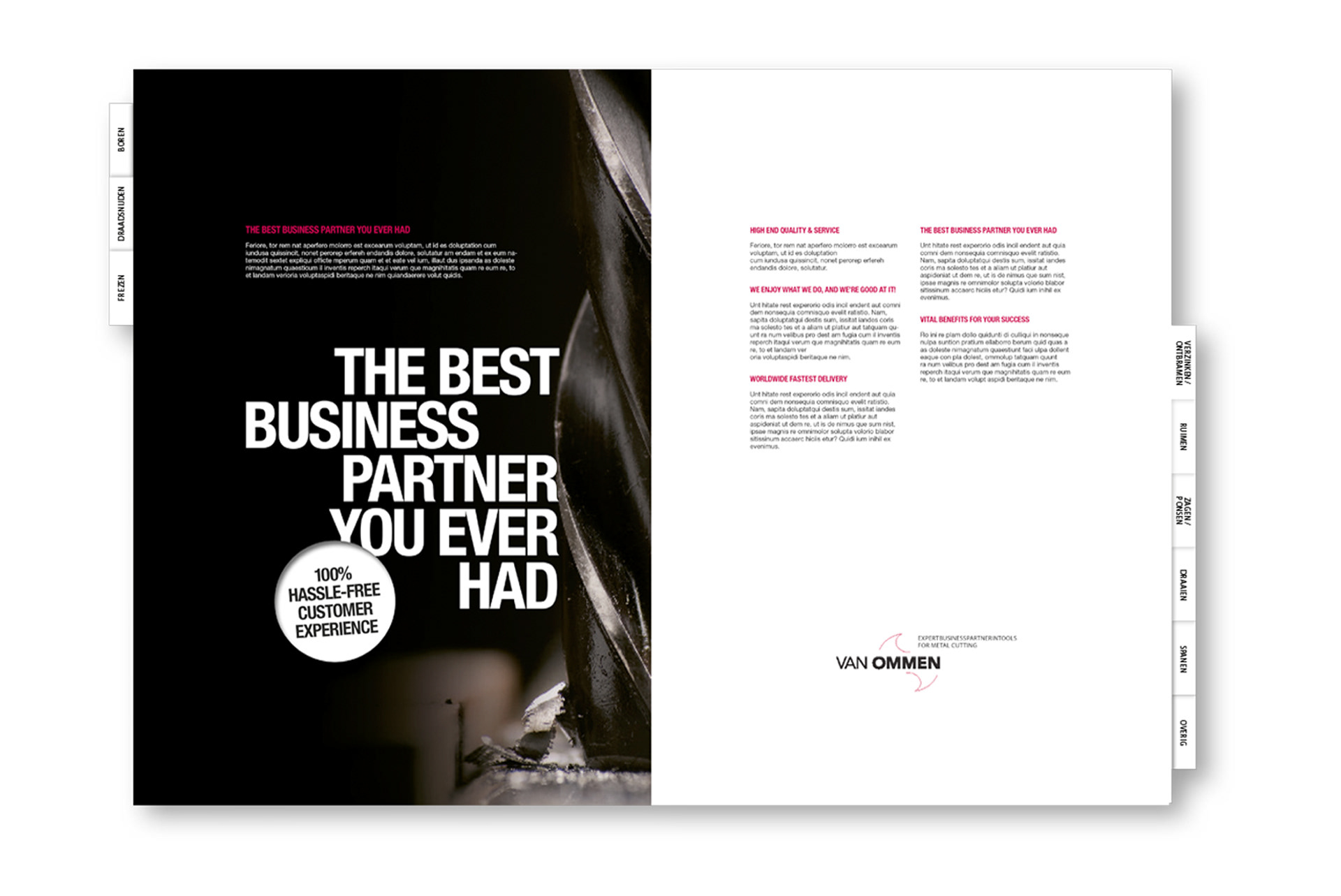 Redesign voor een naslagwerk van gereedschappen (mapomslag en inhoud) voor Van Ommen, leverancier van verspanende en spangereedschappen voor metaalbewerking in heel Europa.